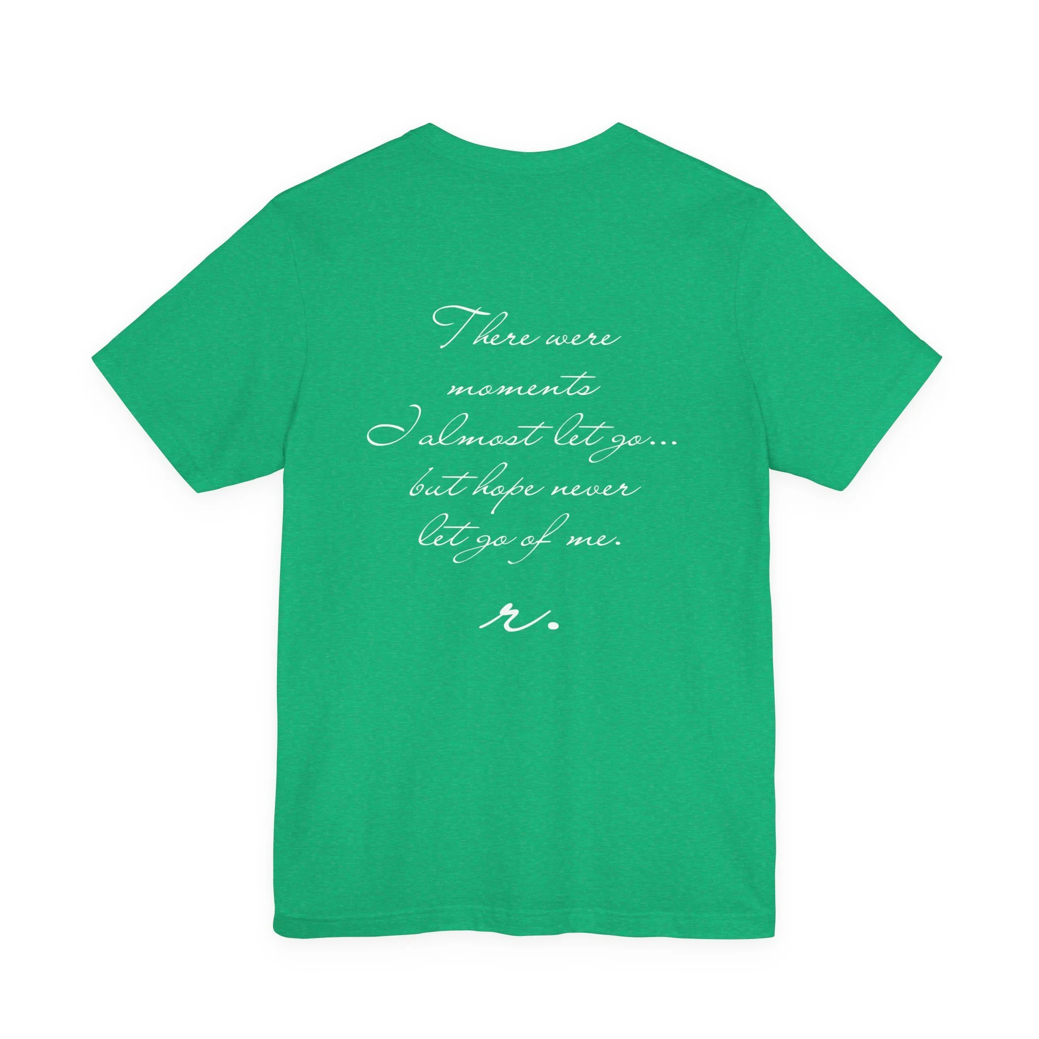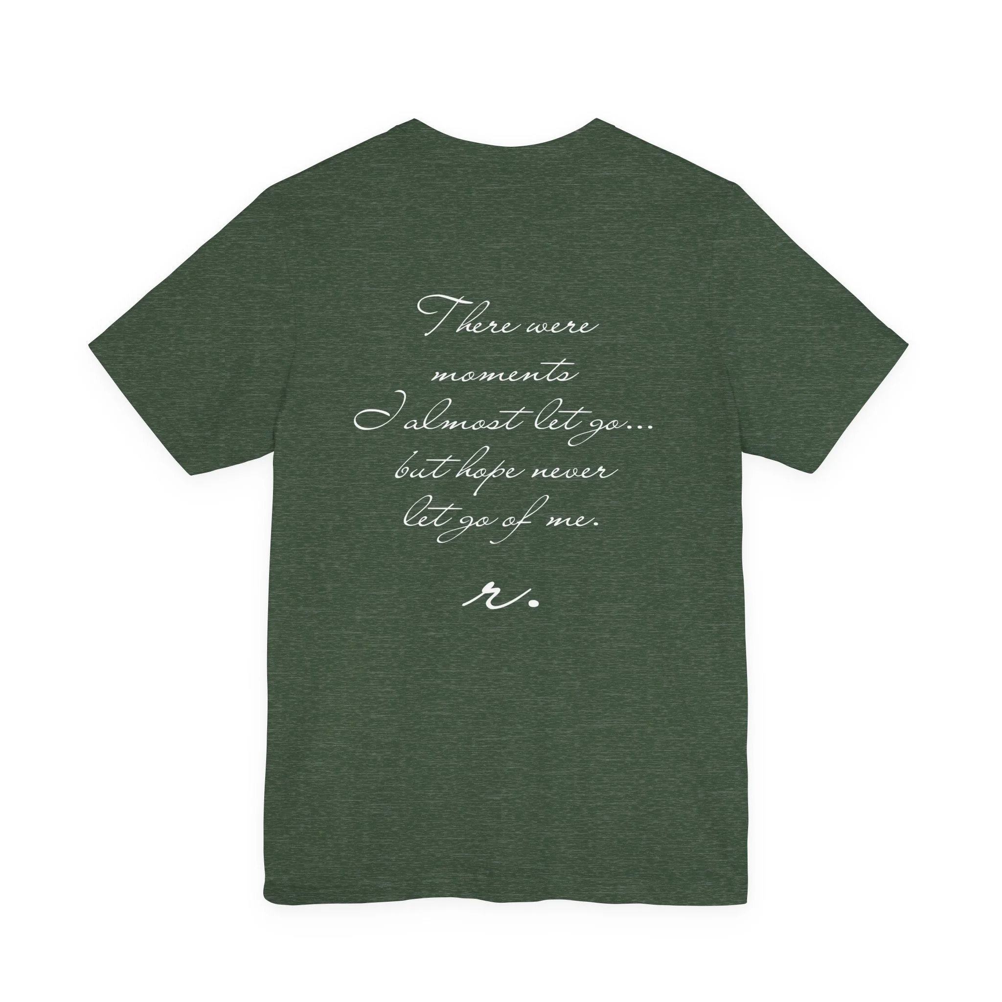 This lightweight crew tee carries a quiet, hopeful voice — simple front lettering and a gentle, handwritten-back message that lingers. Soft Airlume combed ring-spun cotton feels breathable and lived-in from day one, while side seams and a ribbed knit collar keep the shirt neat through repeated wear. Wear it as a subtle reminder on slow mornings, during walks, or layered under a jacket when you want your wardrobe to speak softly but clearly. The understated design suits someone who values calm optimism and subtle, meaningful details.